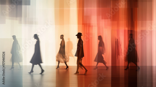 Artistic runway scene with models in elegant poses against abstract backdrop