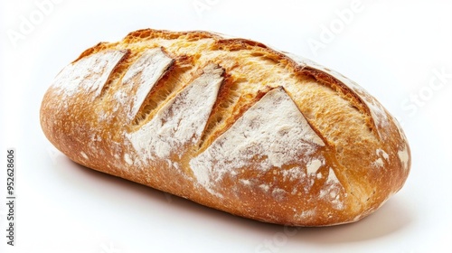 Artistic shot of a loaf of bread with a dusting of flour on the crust, set against a bright white background, emphasizing its freshness and simplicity.