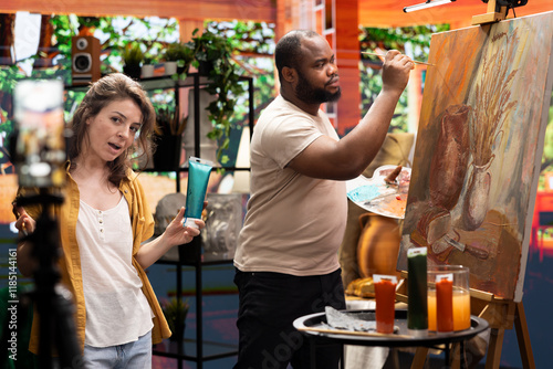 Artists recording the creative process of painting an artwork piece, hosting an online art class for instruction and remote learning. Diverse painters showing their supplies and paint tubes used.