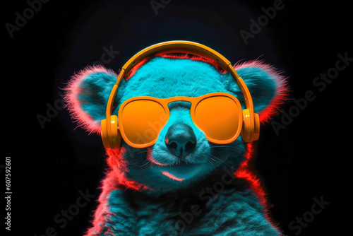 Artwork Illustration of koala in headphones leastening music. Generative AI