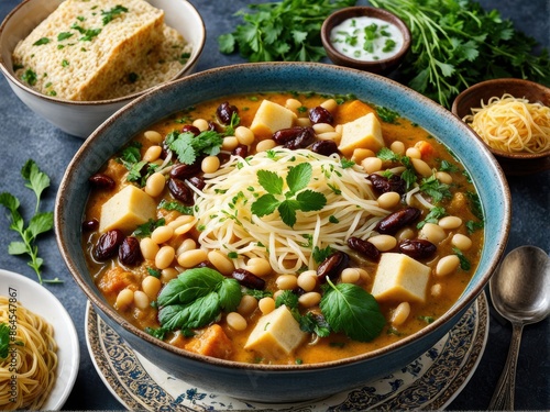 Ash-e Reshteh: Hearty soup with herbs, beans, Persian noodles, and a thick sour dairy product. Iranian cuisine. generative AI