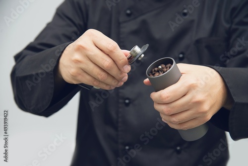 Asian barista is using hand coffee bean grinder prepare to make hot coffee