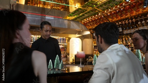 Asian bartender using strainer all ingredients alcohol liquor and syrup tasty in cocktail glass at decorated christmas trees serving refresh drink to VIP couple guest nightlife at nightclub. Vinosity.
