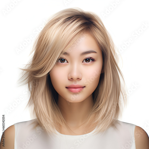 Asian blonde girl with a fashionable hairstyle, styling on a white background. The concept of natural makeup, hair care.