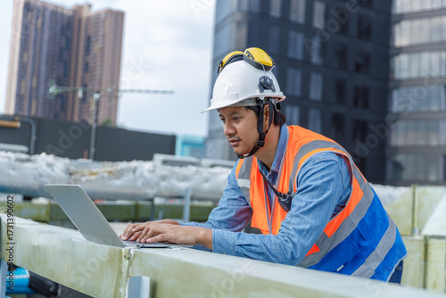 Asian construction engineer wearing safety vest and helmet working on laptop at construction site, inspecting building progress and managing project with digital tools.