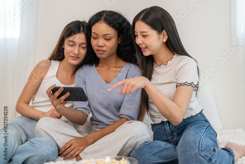 Asian friends watching videos together sharing content on smartphone at home, multicultural young women with social media entertainment digital lifestyle, gaming, online shopping and entertainment app