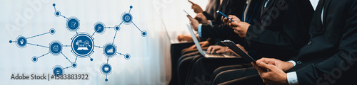Asian job applicant in identical formal wear sitting in waiting room for job interview. Office worker or business people working in cramped room together using laptop and phone. Trailblazing Amity