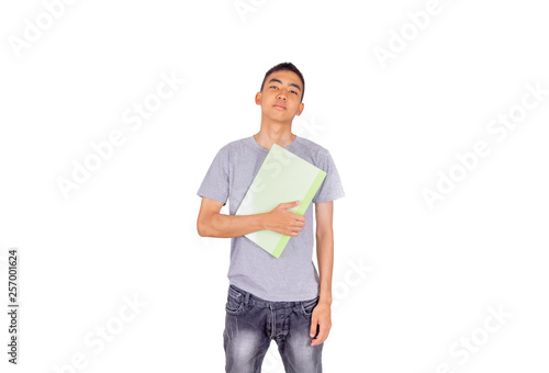 Asian man holds a book by his right arm