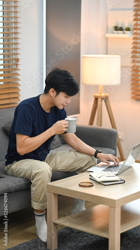 Asian man in casual clothes drinking hot coffee and using laptop on couch at cozy living room