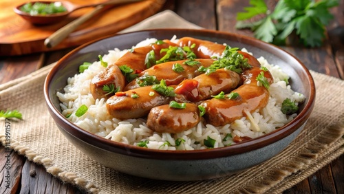 Asian Singapore rice dish with roasted chicken sausage and savory gravy sauce , food, Asian cuisine, Singaporean, rice, sausage