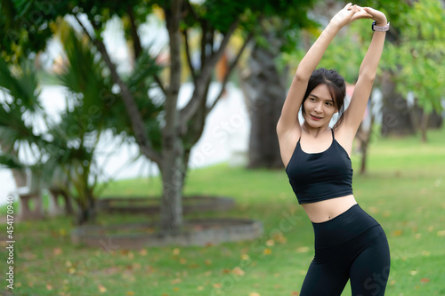 Asian slim woman exercise alone in the park,Tired from workout