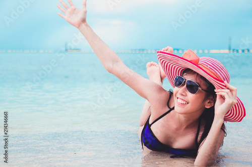 Asian woman in bikini and sun hat relaxing at sunny beach,remote tropical beaches and countries.