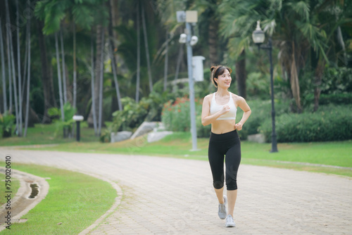asian woman jogger running in green nature public park.
