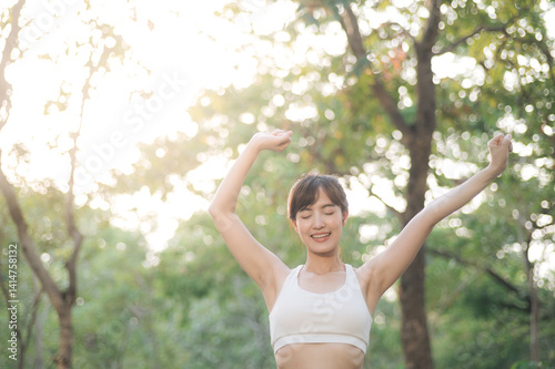 Asian woman outdoor workout, healthy and active lifestyle concept. She stretches her arms in serene forest setting, enjoying fresh air