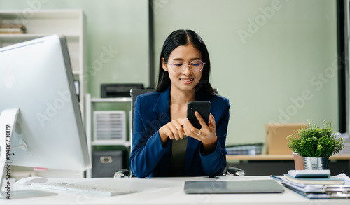 Asian woman sitting at a desk using a laptop computer Navigating Finance and Marketing