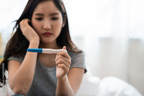 Asian woman sitting bed feeling disappointed when see the pregnancy test result. Woman feels worry and not ready to be a mother. Man feeling stress about the future kid holding head.