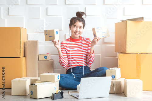 Asian women at the office of the online shopping business in the home office. Start a business, a business entrepreneur. SME, concept of online business
