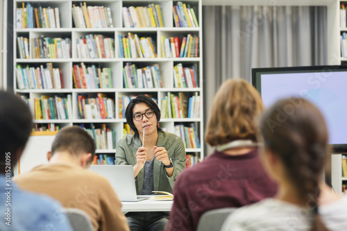 Asian young teacher in eyeglasses sitting at desk and explaining the new material to the group of students in the library