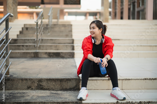 Asian Young woman in red jacket sits on stairs with water bottle and headphones, relaxing after workout in urban setting, bright sunny day, fitness lifestyle