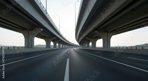 Asphalt highway curves beneath elevated concrete overpasses, sunny sky