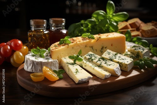Assorted cheese slices on rustic wooden board for captivating charcuterie presentation