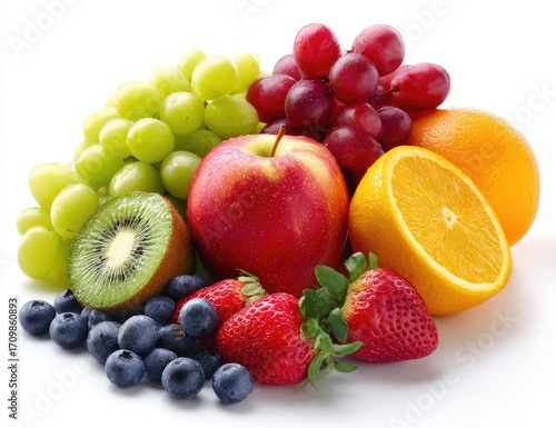 Assorted fresh fruits against white background. A vibrant display of various colorful fruits, including green grapes, red grapes.