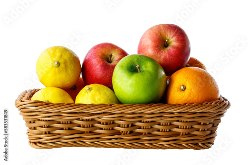 assorted fresh fruits apple,orange,lemon,in a square basket on white background, with copy space.