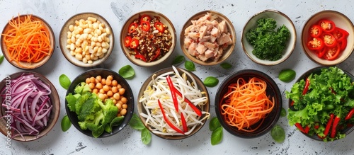 Assorted Healthy Vegetables and Ingredients on a Table for a Balanced Meal Variety of Nutritious Foods like Carrots Peppers Chickpeas Leafy Greens and More for a Plant Based Vegan or Vegetarian Diet