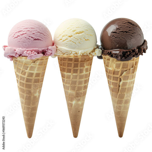 Assorted Ice Cream Scoops in Waffle Cones, PNG Cutout Transparent Background. Mockup Template for Creative Design.