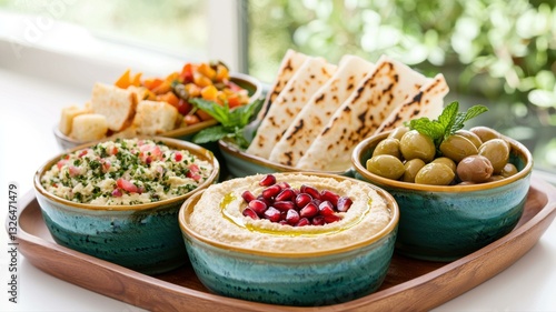 Assorted Mediterranean dishes with olives, hummus, and pita on a wooden tray.