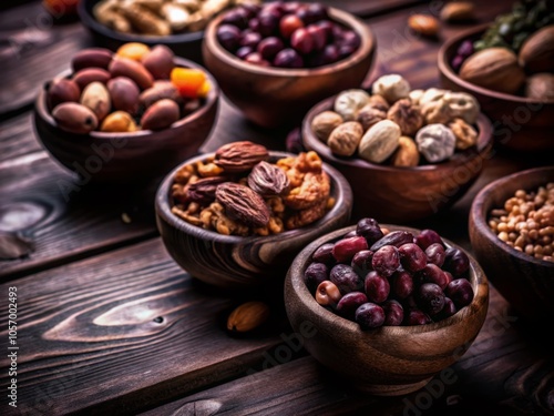 Assorted Nuts and Dried Fruits in Wooden Bowls - Healthy Snack Inspiration for Food Photography