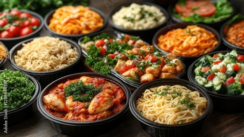 Assorted pasta dishes in black takeout containers on a wooden surface