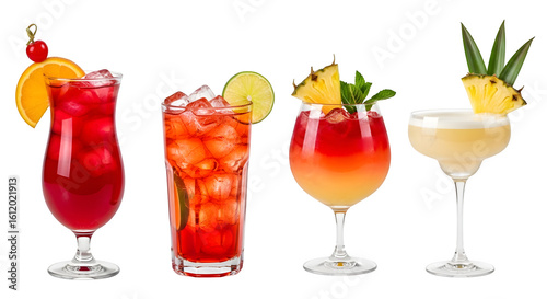 Assorted Refreshing Cocktails, Featuring Tropical Fruit Garnish, in Elegant Glassware on transparent background