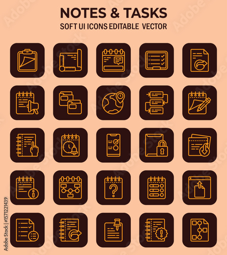 Assorted soft user interface icons depicting notes and tasks in an organized layout providing minimalist design