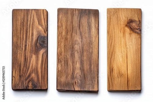 Assorted Wooden Planks with Unique Grain Patterns - Three wooden planks showcasing distinct grain patterns and textures against a solid white background