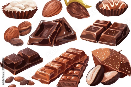 Assortment of chocolate bars, candies, and nuts on white background.
