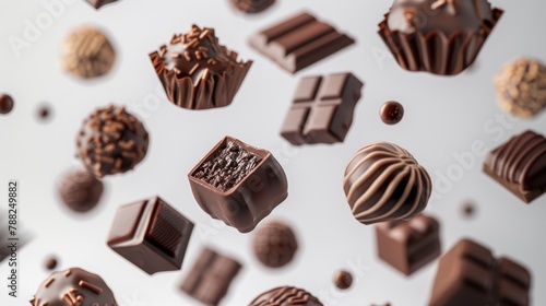 Assortment of chocolate candies and sweets flying in the air on white background. Truffles, creamy milk bonbons, sweet food concept banner