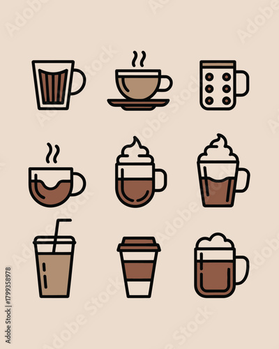 Assortment of coffee, tea, and hot beverage cup icons in a minimalist vector style. Vector
