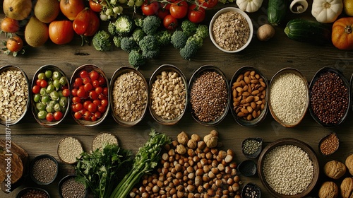 Assortment of healthy foods displayed in bowls on a wooden surface, with vegetables and fruits in the background; a nutritional display for a health and wellness theme