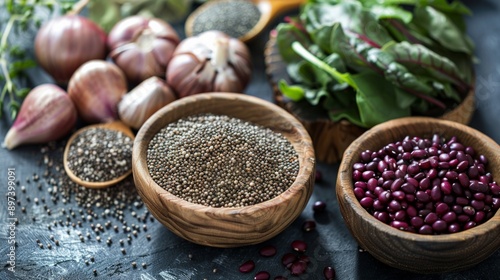 Assortment of oriental spices in a wooden dish. Ingredients containing iron and dietary fiber, natural sources of ferrum, healthy lifestyle, food and nutrition.