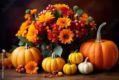 Assortment of pumpkin and flowers autumn harvest Happy Thanksgiving pumpkin