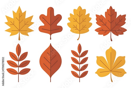 Assortment of Stylized Autumn Leaves and Acorns in Flat Design on a White Background fall leaf