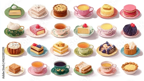 Assortment of sweet treats and beverages. A collection of desserts and tea in various colorful designs