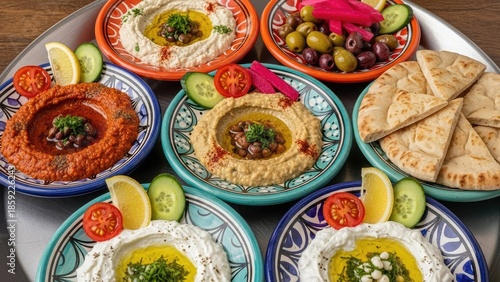 Assortment of traditional middle eastern dips and appetizers including hummus, baba ganoush, tzatziki, olives, pita bread, and garnishes on decorative plates arranged