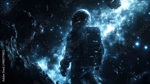Astronaut Standing Amidst Asteroid Field in a Starry Nebula