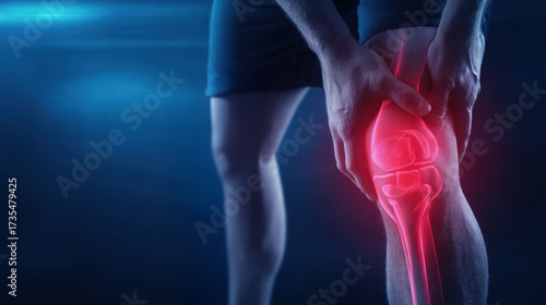 Athlete holding knee with pain highlighted by glowing red bones, symbolizing injury or joint problem.