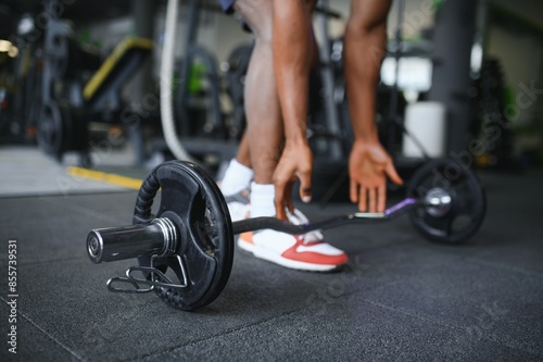 Athletic black guy making weightlifting or powerlifting at modern gym