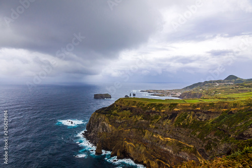 Atlantic Ocean coast of Sao Miguel Island, the largest island in the Portuguese archipelago of the Azores. Feteiras village on background
