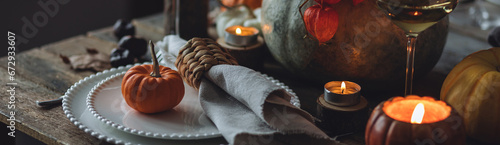 Atmospheric autumn elegant beautiful table setting with pumpkins for a wedding or thanksgiving family celebration. Fall decoration countryside rustic style, cozy home atmosphere , candles, wine banner