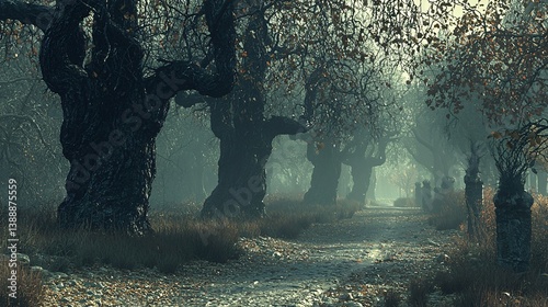 Atmospheric path through dense trees, light mist, and fallen leaves